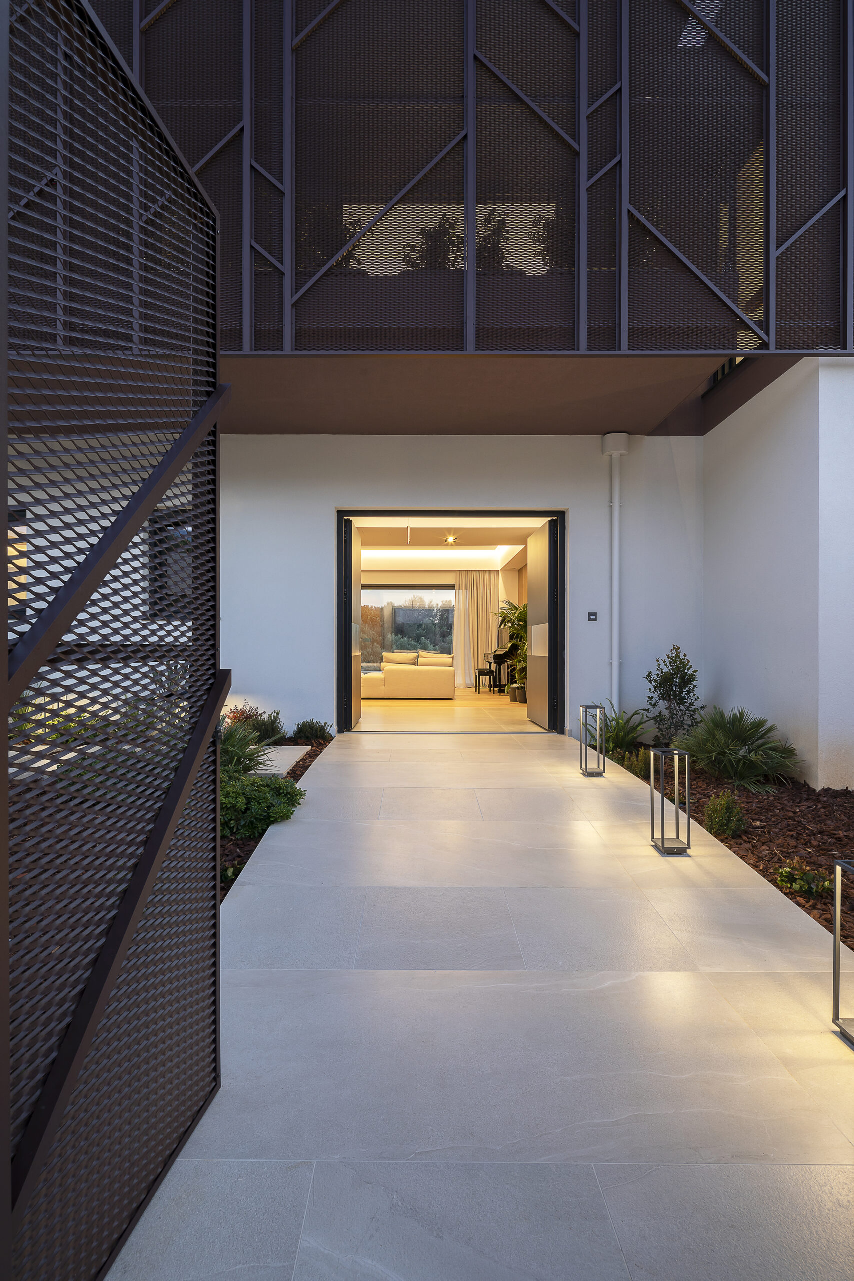 Κατά μήκος αυτού του ορίου χωροθετήθηκαν όλοι οι χώροι βοηθητικών χρήσεων και λόγω της συνθήκης ότι το αστικό όριο ήταν στον βόρειο προσανατολισμό, η διάταξη αυτή λειτούργησε ευεργετικά και ως προς τις αρχές του Passive House και τον βιοκλιματικό προσανατολισμό των χώρων. Έτσι, οι κύριοι χώροι διημέρευσης απολαμβάνουν τον νότιο προσανατολισμό, μέσω μεγάλου μεγέθους ανοιγμάτων, με την υποστήριξη των απαραίτητων προστεγασμάτων ώστε να ρυθμίζεται η ποσότητα εισερχόμενης ηλιακής ακτινοβολίας όπως απαιτείται σύμφωνα με την κάθε εποχή στο κλίμα της Ελλάδας.